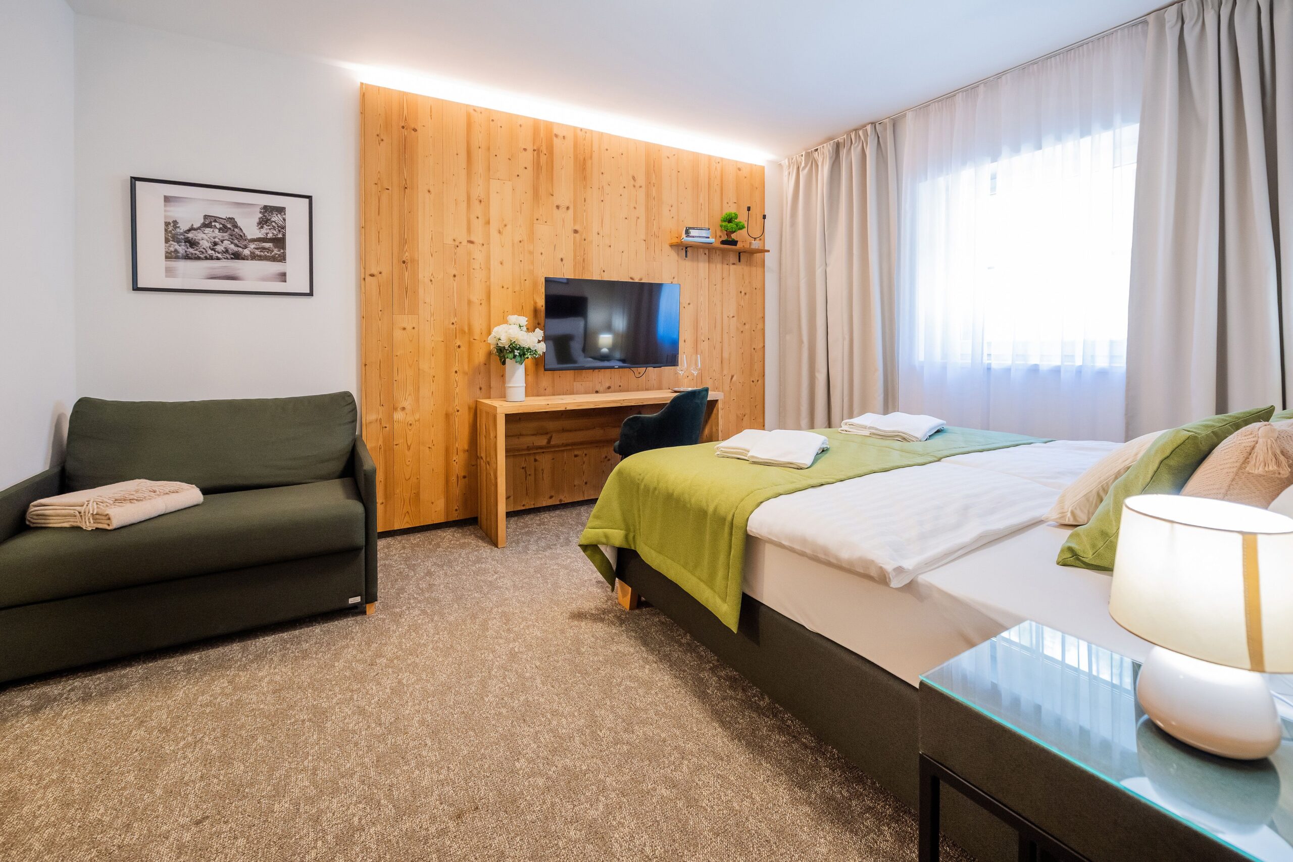 Izby poskytujú pre našich hostí dokonalý oddych po náročnej túre či lyžovačke. Novo zrekonštruovaná izba Vám ponúkne komfortné ubytovanie v modernom horskom štýle. Izba sa skladá zo vstupnej chodby so skriňou, samostatnej kúpeľne so sprchovým kútom, toaletou a umývadlom. Izba disponujem kvalitnou manželskou posteľou, nočnými stolíkmi a kreslom, ktoré po rozložení slúži ako plnohodnotná prístelka pre dieťa alebo aj dospelú osobu vo veľkosti 90x200 cm.